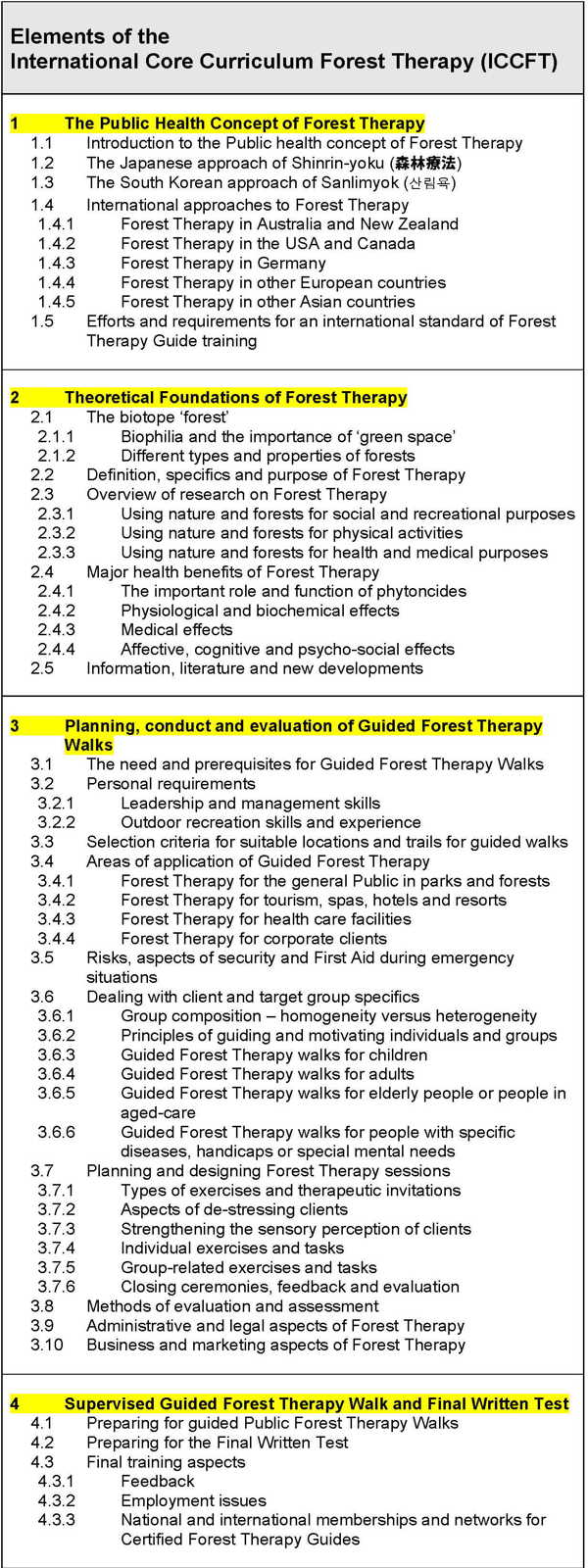 For more details regarding the ICCFT, see the International Handbook of Forest Therapy (edited by Kotte et al 2019).